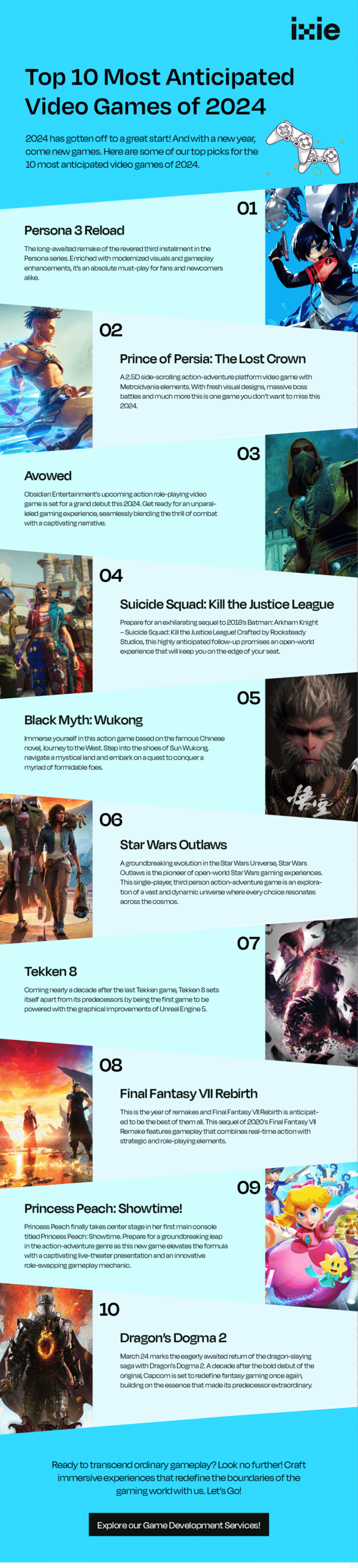 In a world where pixels and polygons collide to create magic, we present to you our handpicked selection of the top 10 most anticipated video games of 2024. From cutting-edge graphics to immersive gameplay, join us as we unravel the veil of the future and unveil the game development wonders that await. Are you ready to dive into the next level of excitement? Read our infographic below!